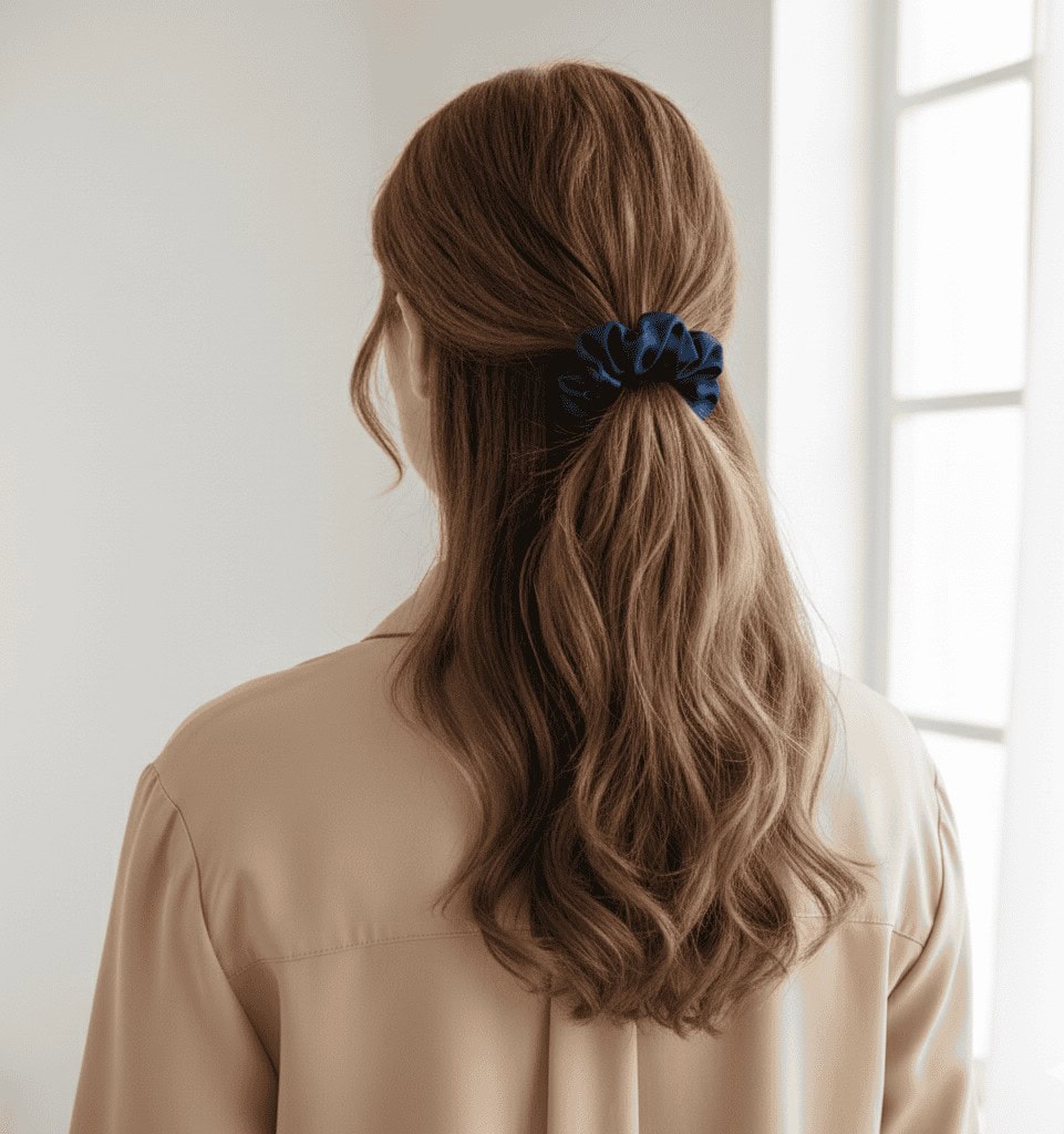 Élégant et intemporel, le Chouchou Élastique Couleur Bleu Nuit apporte une touche de raffinement à vos coiffures. Sa texture satinée fluide et brillante met en valeur la profondeur de cette teinte intense, parfaite pour un look sophistiqué. Réalisé à la main, ce chouchou doux et soyeux respecte vos cheveux tout en offrant une excellente tenue, sans les abîmer ni les marquer. Idéal pour sublimer un chignon, une queue-de-cheval ou une demi-attache avec une note chic et discrète.