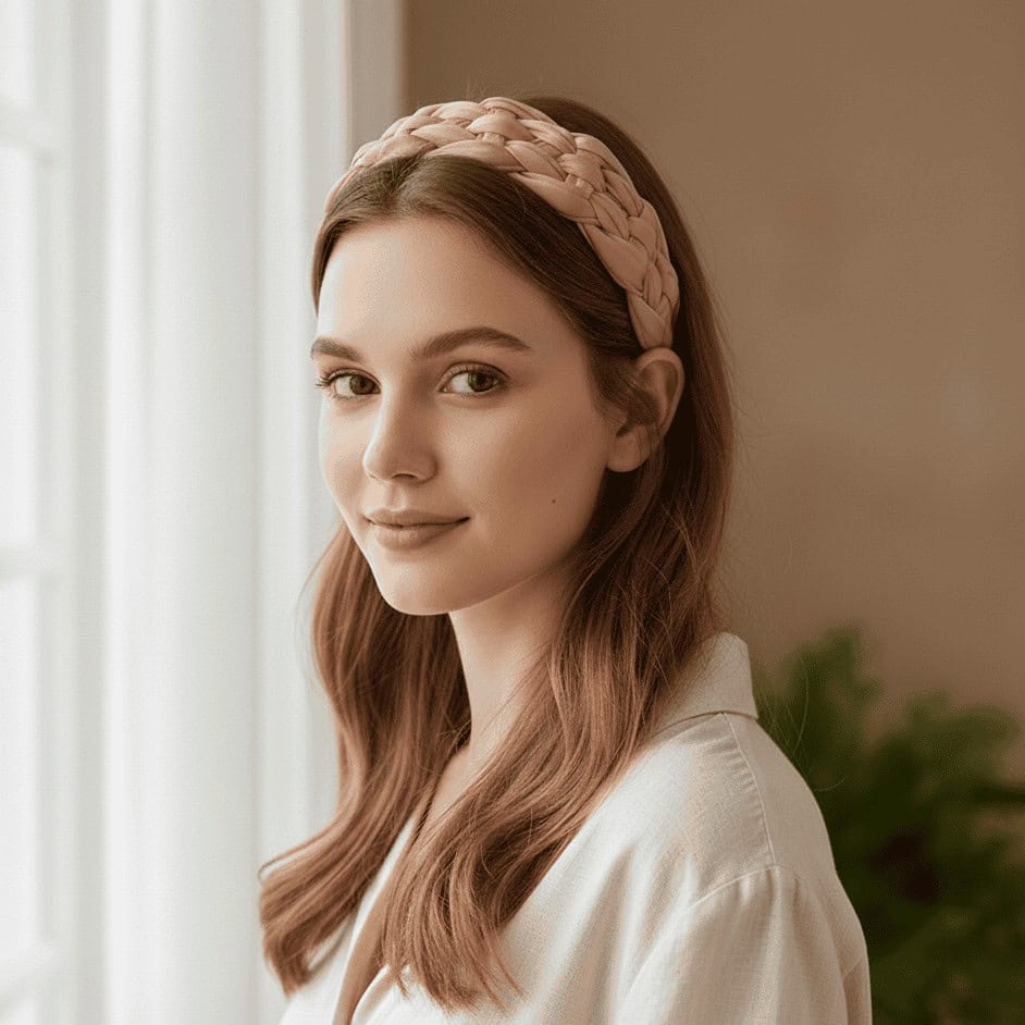 Serre-Tête Large en Tissu Tressé Rose Poudré